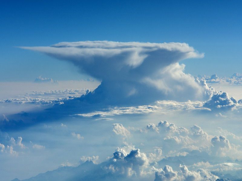 A classic looking thundercloud, shows where the storm has reached the stratosphere, the zone in the atmosphere where the temperature gradient reverses. Here the air spreads and the cloud cannot grow further, creating the anvil shape.