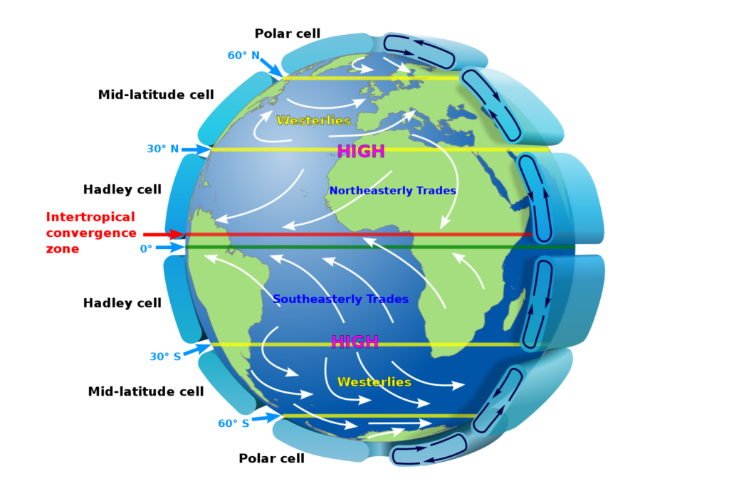 The difference from a pasta pot and the earth is the Coriolis effect. The earth’s spin helps deflect the air in non linear patterns. On the surface, between the tropics and subtropics, the trade winds are the lower part of this convection cell. The earth’s spin also allows thunderstorms to organize into tropical systems, hurricanes, typhoons and cyclones, which in turn move towards the poles taking all that solar energy with them.